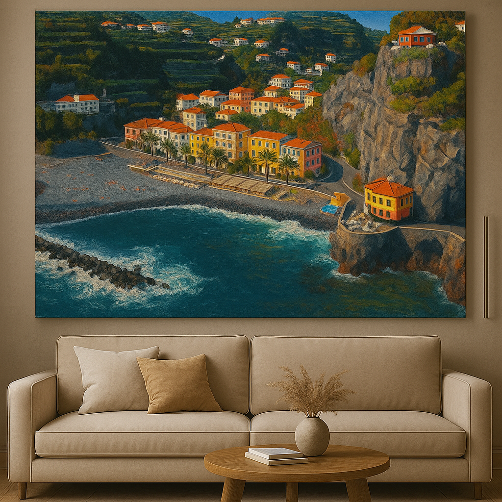 Perfectly placed above a neutral-toned sofa, the painting’s rich hues of terracotta, sea blue, and lush greenery create a stunning focal point for any modern or classic interior. Hand-painted on a deep-edged canvas, this artwork offers both a scenic escape and a refined aesthetic.